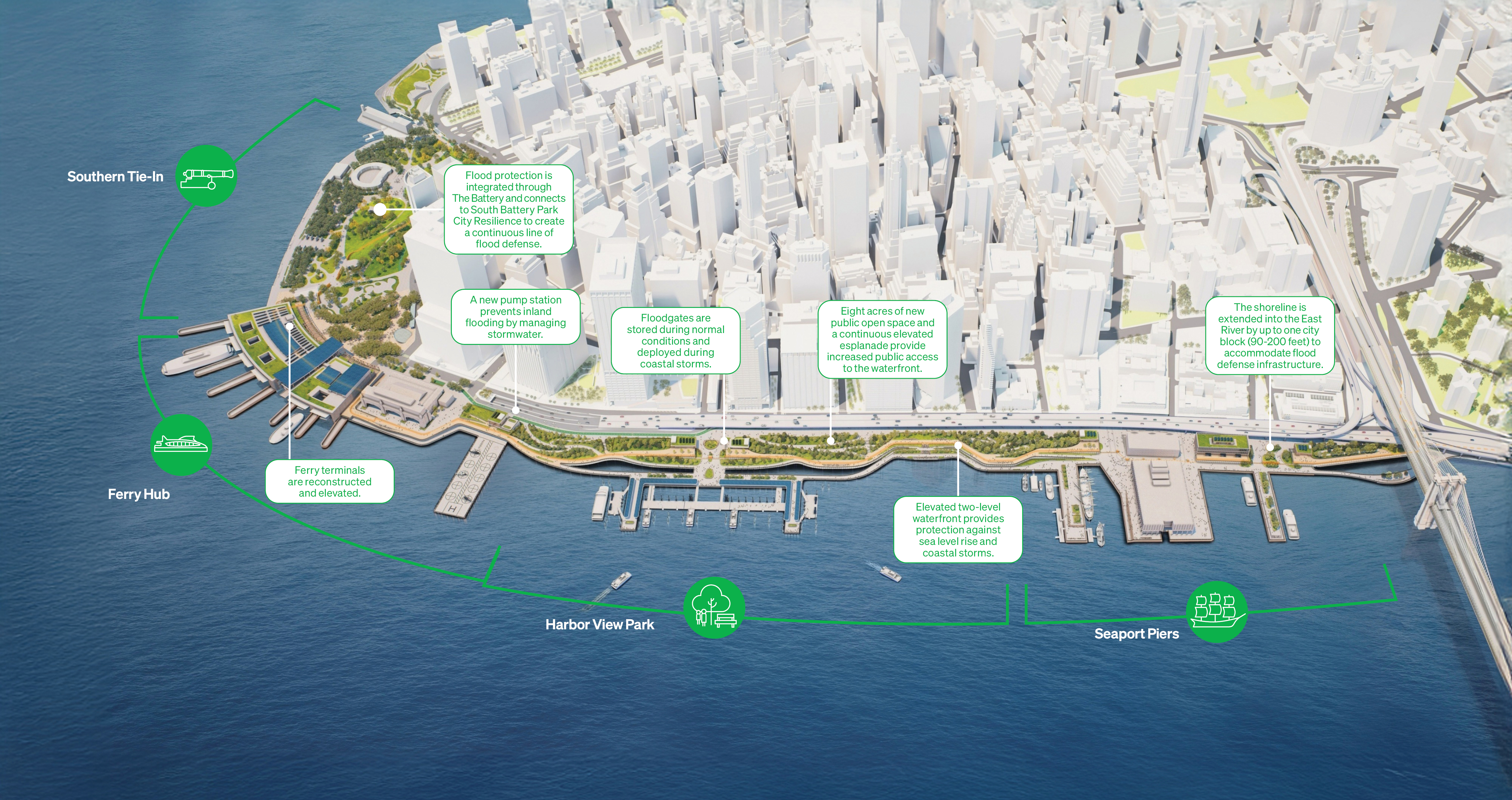 A resilient ferry hub integrates shoreline protection with active maritime operations, supporting continued ferry service while strengthening the Financial District waterfront.
