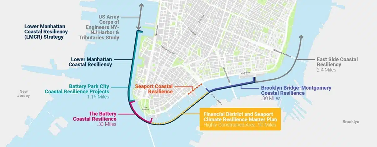 The Financial District and Seaport Climate Resilience Master Plan is part of the larger Lower Manhattan Coastal Resiliency Strategy that aims to protect all of Lower Manhattan from flooding.