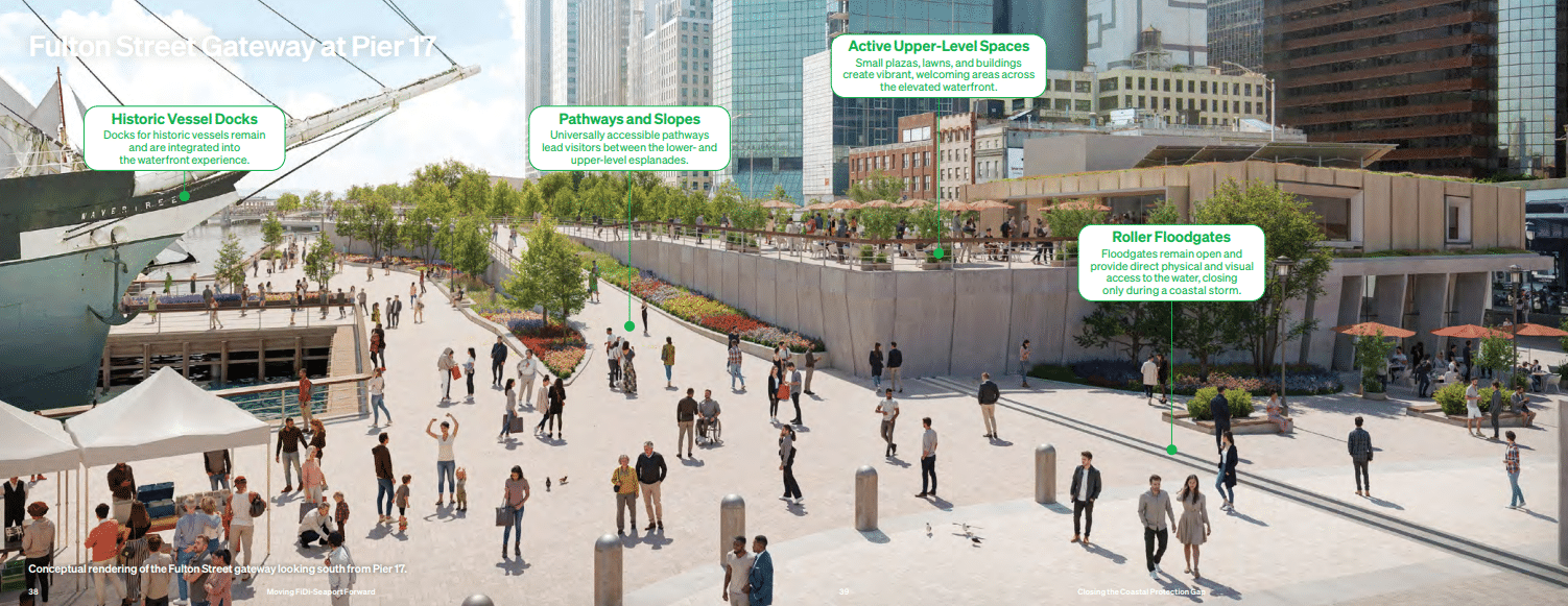 Major design moves integrate flood protection, continuous waterfront access, and civic space, reconnecting the Seaport to Lower Manhattan while supporting resilient ferry operations.