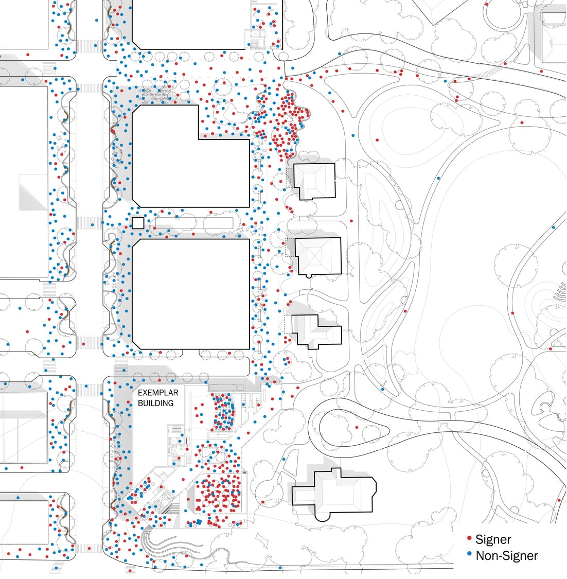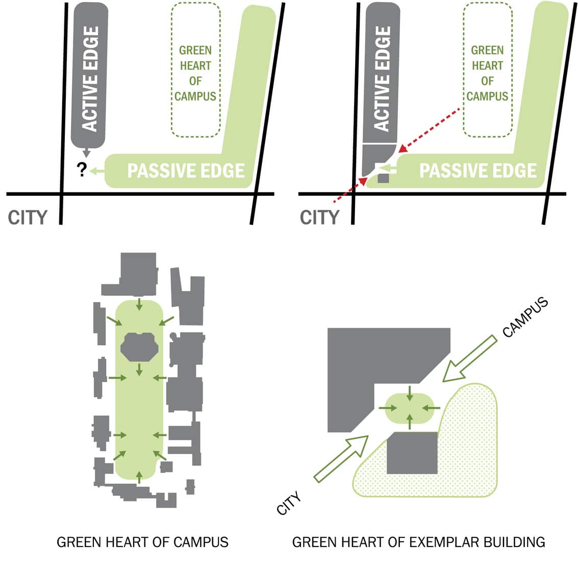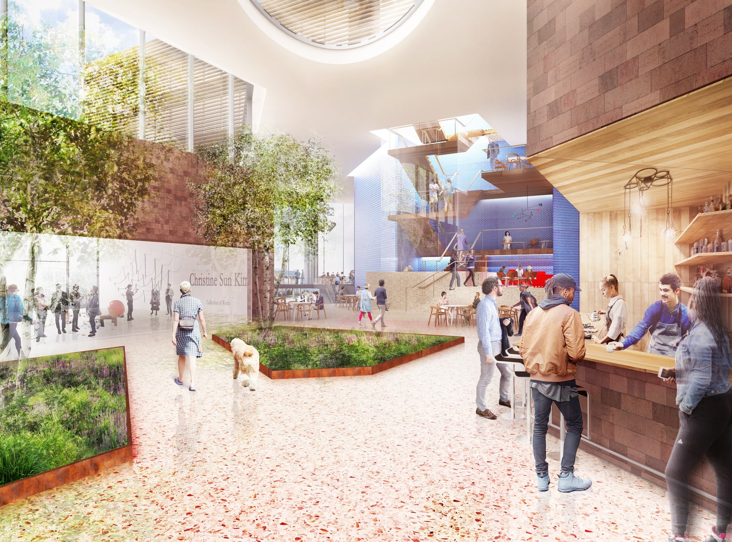 The Exemplar Building is organized around a planted central atrium where the theater, event space, café, and diagonal campus shortcut converge, supporting daily use and spontaneous interaction.
