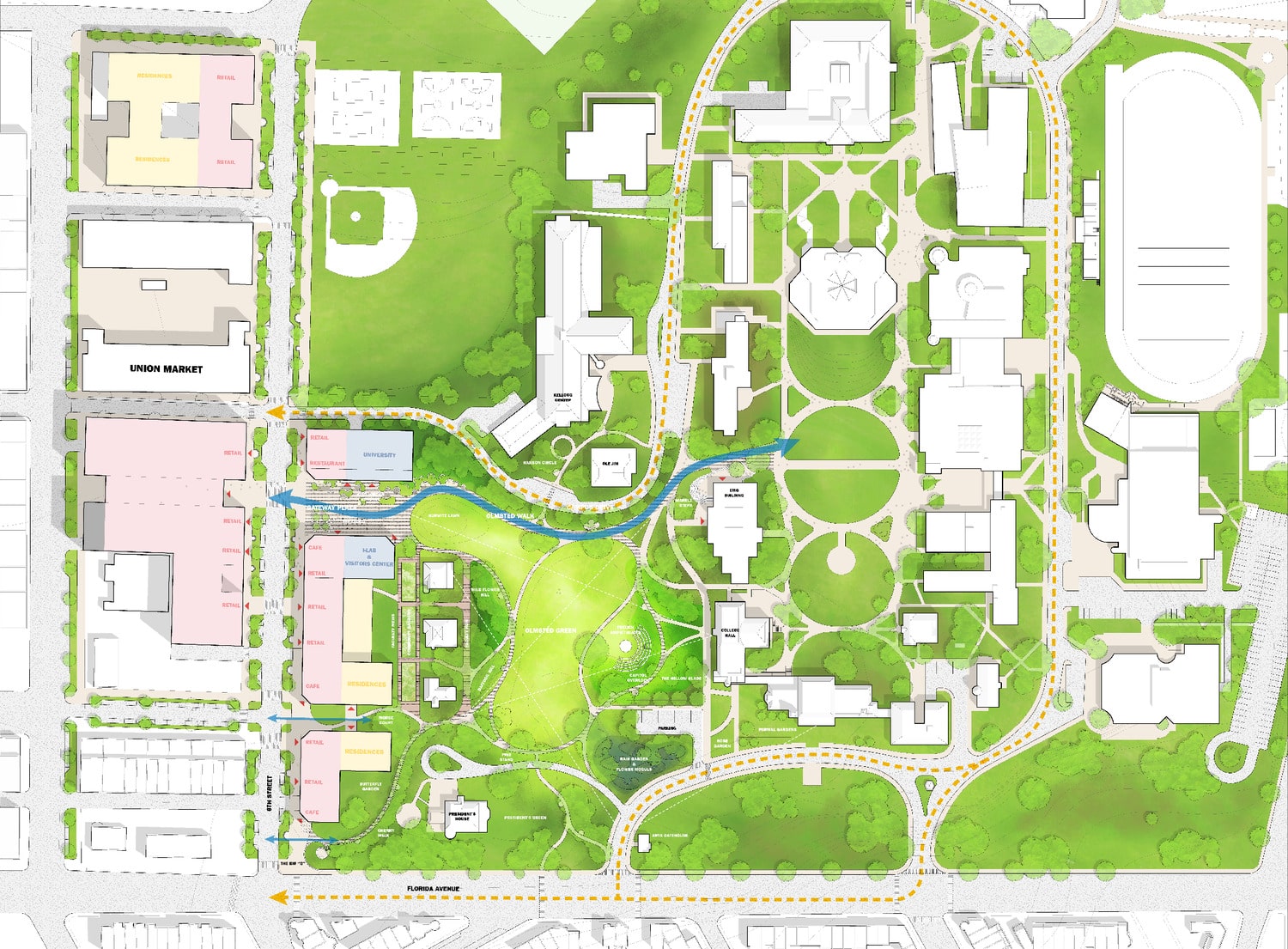 Tapscott Plaza and Olmsted Green Site Plan: Plan view of the Active Edge linking 6th Street to the campus core, organizing Tapscott Plaza, serpentine benches, the Haptic Beacon, and Olmsted Green into a continuous public realm sequence.