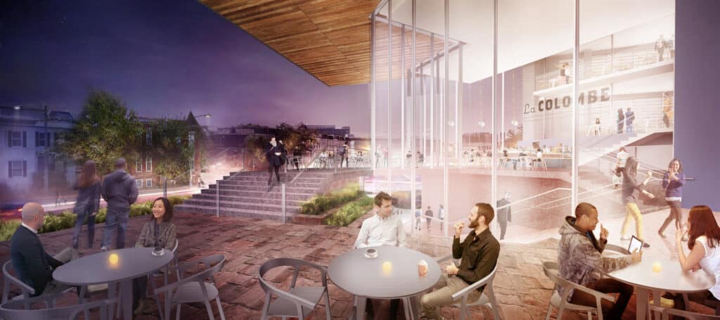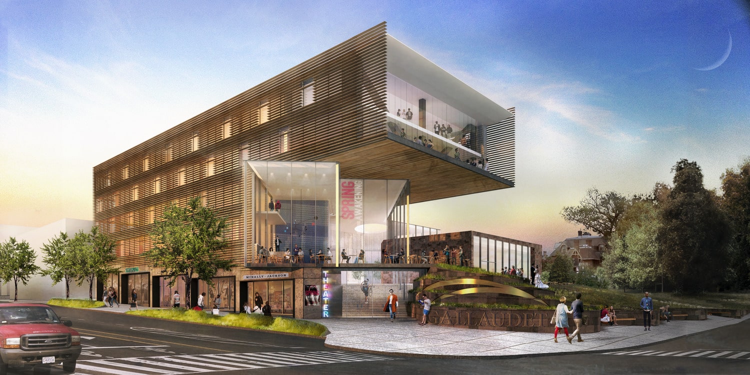 The Exemplar Building from Florida Avenue and 6th Street: The Exemplar Building anchors the Active Edge, projecting Gallaudet’s identity to the neighborhood while sheltering the campus core. Drawing on DeafSpace principles, the building creates an active, elevated vantage point embraced by the Deaf community.