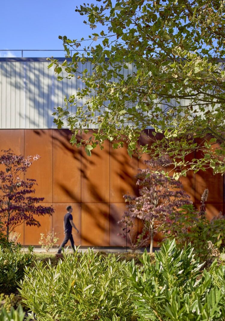Set on what was a wooded 3-acre site, the building program is organized into three separate pavilions placed gently on the site, preserving existing mature trees and respecting the natural sloped topography.