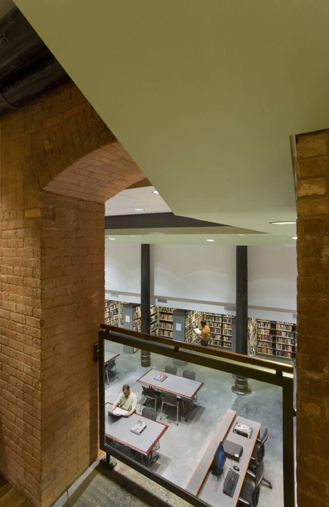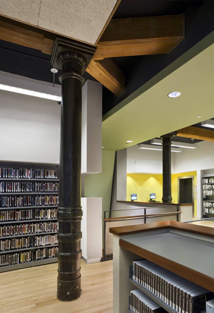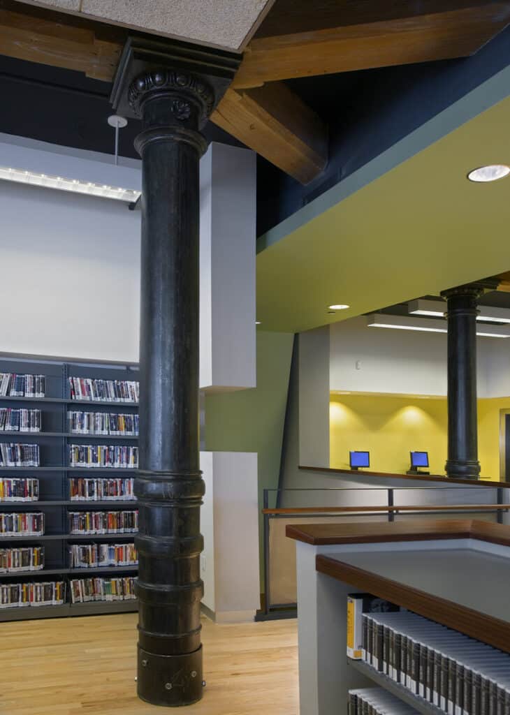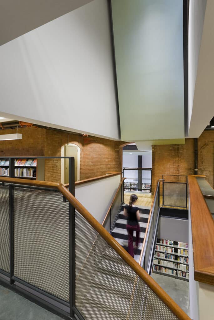 Located in a former chocolate factory, this 15,000SF library connects ground-level reading and entry spaces with below-grade collections, study areas, and community rooms. A central stair and sculptural ceiling ribbon draw light and movement through the interior, linking all levels and encouraging discovery. The design weaves new infrastructure and tactile materials into the building’s original fabric of exposed brick, heavy timber beams, and cast iron. Existing structural elements are reinterpreted to support library functions, including a massive timber beam repurposed as a computer kiosk. A new ramped sidewalk and angular canopy create a clear entry on Jersey Street, while integrating the building’s ventilation system.