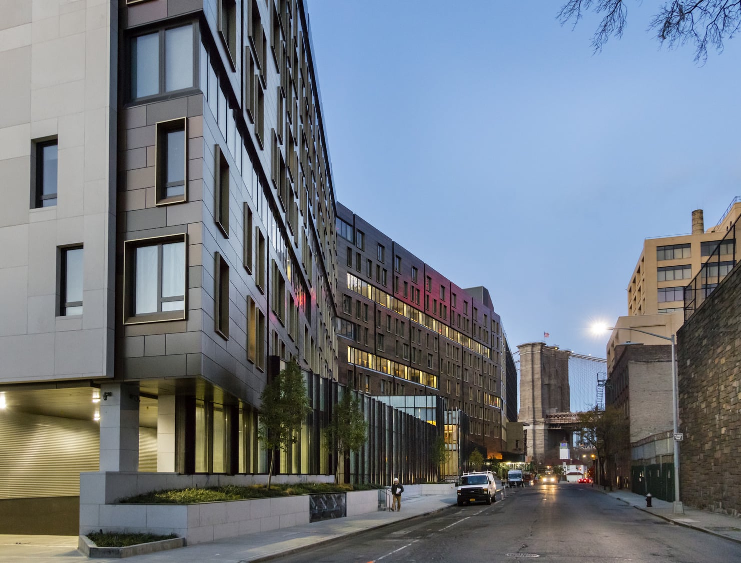 The Furman Street facade rises in a series of articulated metal and stone panels, shaping a stepped profile that aligns with the narrow street while preserving views toward the Brooklyn Bridge.