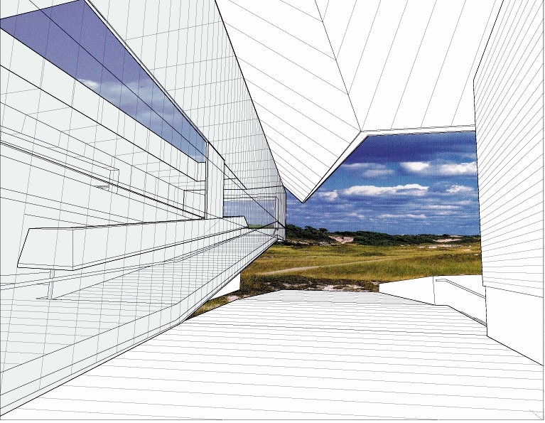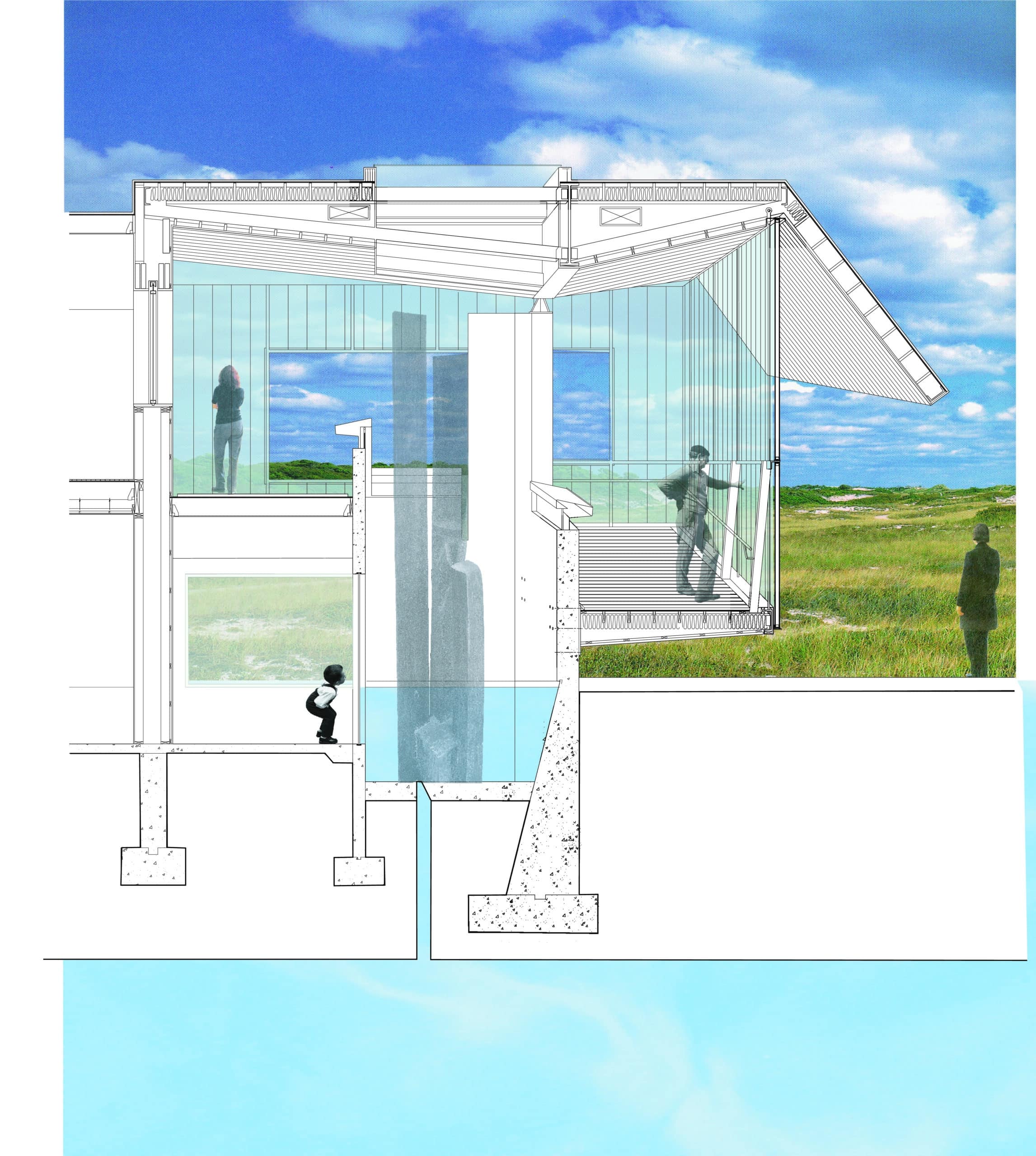 Shifting views and reference points both inside and outside the building play with perception of the horizon.