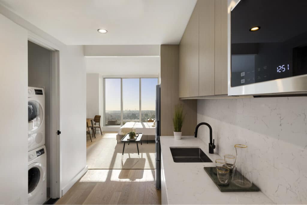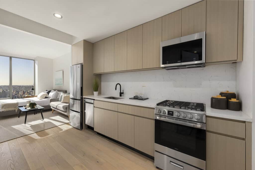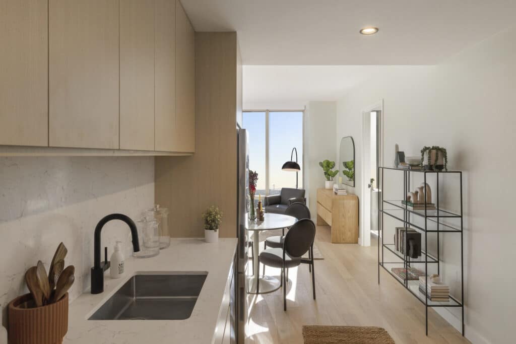 Rising 43 stories above the vibrant Fulton Street corridor, The Paxton pairs modern luxurious residences with retail at its base. Residents enjoy lifestyle-driven amenities, from a fitness center and yoga studio to indoor lounges and landscaped rooftop terraces with sweeping city views. The interiors are articulated with a rich palette of brass, walnut, plaster, and varied natural stones. These finishes are carefully composed to highlight contrast and texture, balancing warmth with refinement and creating a sense of permanence and hospitality throughout the spaces.