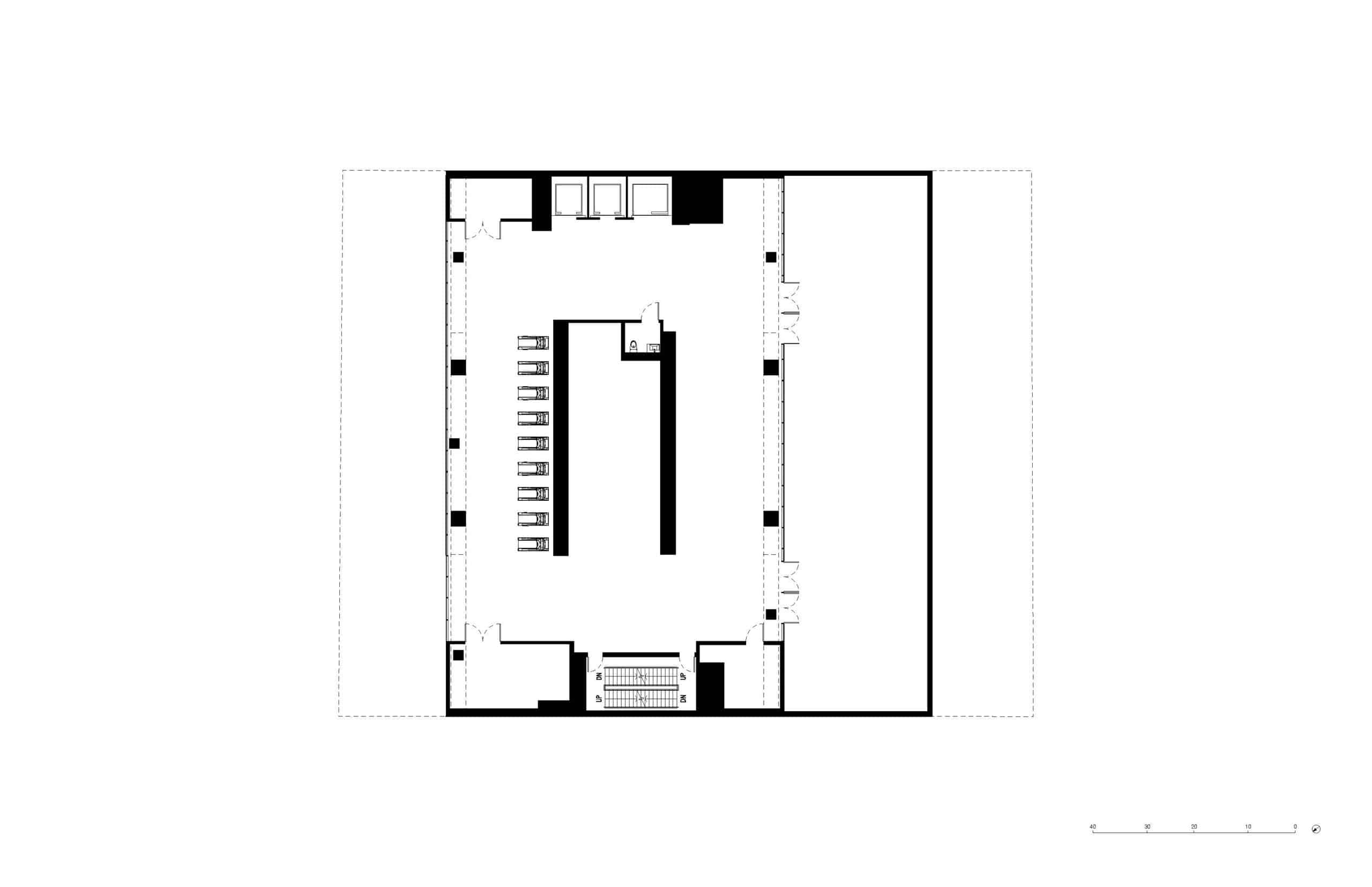 Architecturally, the setback mass of the tower is divided into two groupings of six floors and between them the office spaces access outdoor terraces at the 4th floor and the 12th floor.