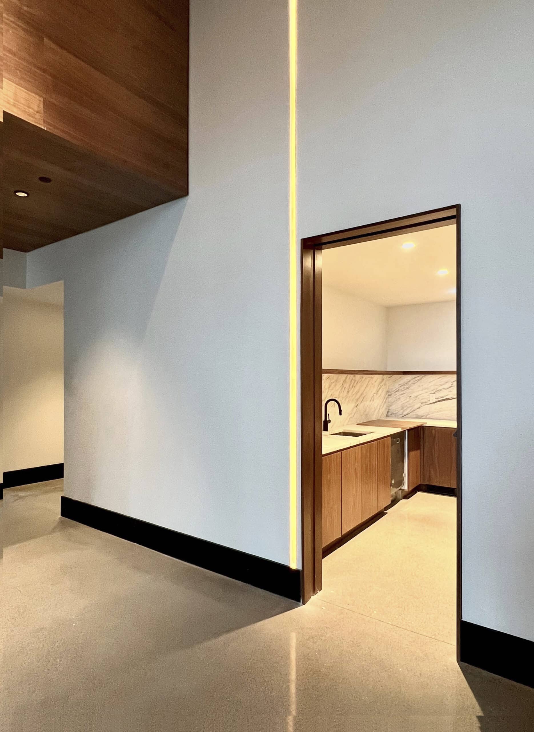 The mailroom plays with contrasting finishes and layered lighting, transforming a functional space into a welcoming experience.